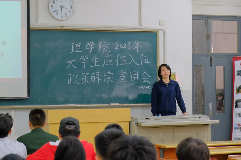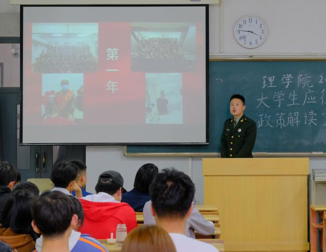 此次活动邀请到沈琳、张锦龙、刘首旺三名入伍退役复学的同学分享他们在服役期间的体验。他们详细介绍了国家征兵政策以及今年征兵主要情况,并就征集对象、条件、报名时间与流程以及普遍关心的服役待遇、退伍补偿、今后在学业、择业上的优惠政策作了详细讲解。