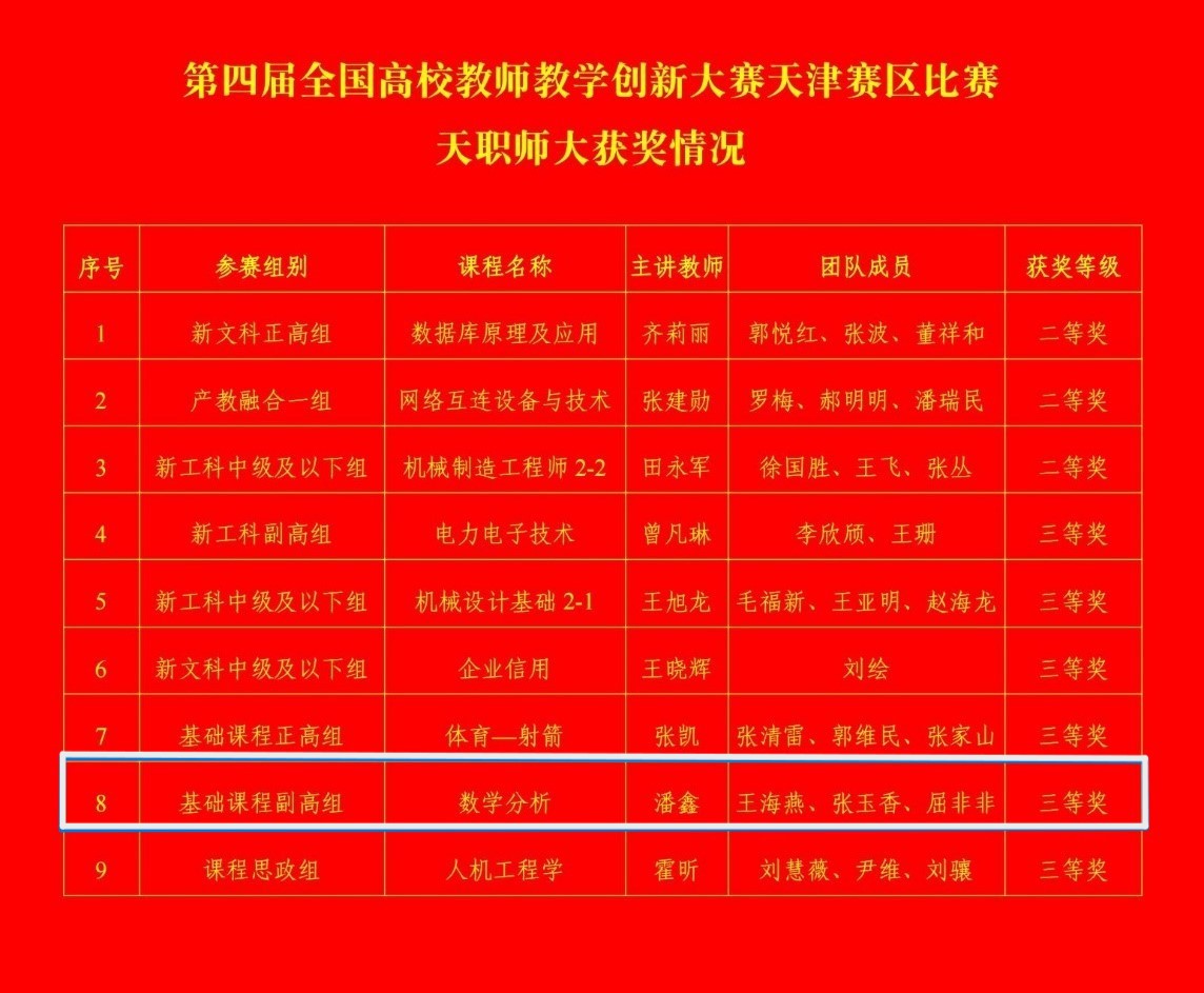 近日,天津市教委公布了第四届全国高校教师教学创新大赛天津赛区比赛获奖名单,304永利集团潘鑫老师为代表的数学分析课程组获得天津赛区三等奖。