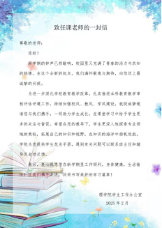 开学初,公司精心组织制作了包含班主任、辅导员联系方式的员工花名册,方便任课教师教学管理,加强沟通联系。撰写《致任课老师的一封信》,诚挚感谢任课老师的辛勤付出,希望能积极沟通教学期望与建议。发布《致304永利集团学子的一封信》,激励同学树立目标、勤奋学习,激发学习动力。