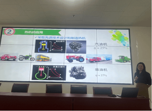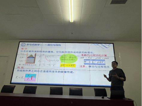 活动第一部分为示范课展示。刘帅老师以《热力学第一定律》为课题,通过能量守恒原理的系统性讲解,结合实验演示与生活案例,阐释了定律的数学表达及实际应用。其课程设计逻辑严谨,重点难点解析清晰,展现了扎实的学科素养。马婧老师则围绕《循环过程》展开教学,通过热机与制冷循环的流程图解、公式推导及能源应用案例分析,突出了理论联系实际的教学特色。其互动式教学设计获得与会教师的高度评价。