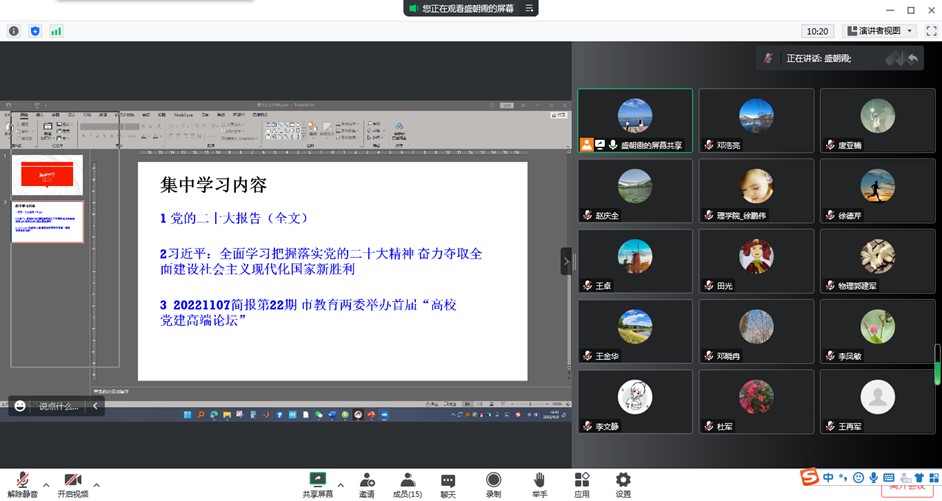 2022年11月8日,304永利集团物理教工党支部通过腾讯会议的形式开展线上集体学习,本次学习的主题围绕学习宣传党的二十大精神,学习内容分为三个部分: