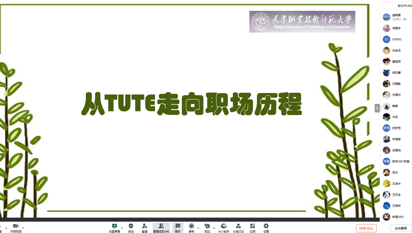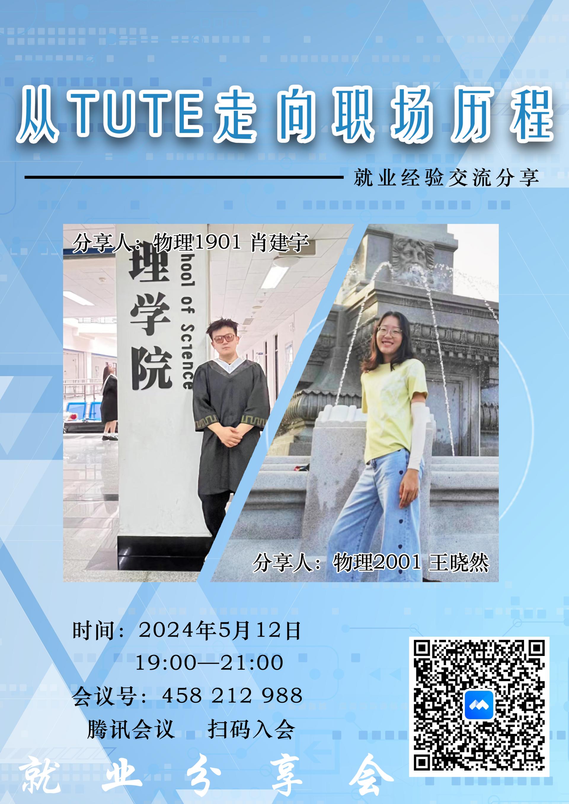 2024年5月12日晚7:00,304永利集团物理教工党支部为发挥好支部的先锋模范作用,特此召开了“从TUTE走向职场历程”的线上就业经验交流分享会。会议由支部书记盛朝霞老师主持,参与的同学覆盖了从大一到大四的各个年级各个专业的员工。本次分享会邀请了物理1901的肖建宇学长(大族激光的激光工程师),和物理2001的王晓然学姐(凯普林光电的激光工程师)。